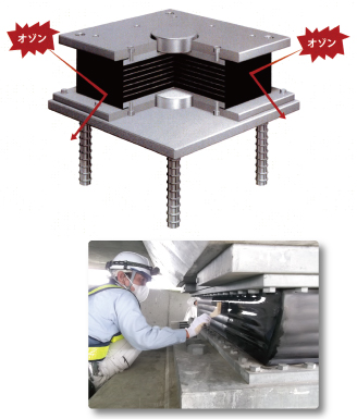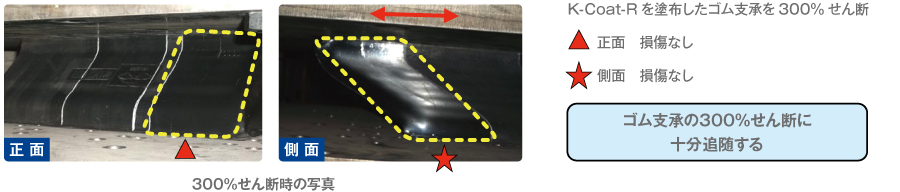 | ①耐候性 道路橋支承便覧規格値の10倍以上の耐オゾン性※ ※規格値の試験時間96h オゾン濃度 50pphm × 温度 40℃ × 50% 伸長 × 1000 時間以上 ②追随性 ゴム支承のせん断変形に対して、300%以上のせん断ひずみにも追随 |