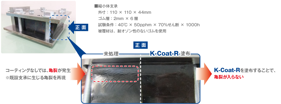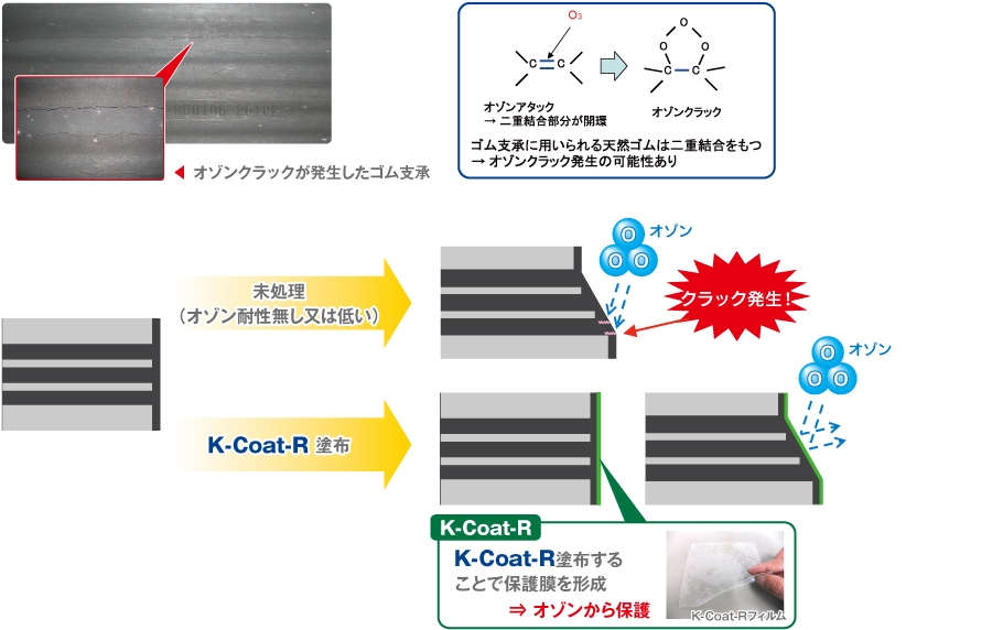 | 旧NETIS NO.KT-140105-VR (NETISへのリンクは こちら ) ゴム支承の耐候性を大幅にアップできるオゾン層劣化防止コーティング工法です。 ゴム支承において、過酷な条件下での使用により、オゾンクラックによる損傷が発生しています。 破損を放置すると、損傷が拡大する可能性も考えられるため、早期の補修が望まれます。 その補修方法の一つとして、被覆ゴムにコーティングする方法があります。 今回、耐候性はもちろん、ゴム支承に生じるせん断変形への追随性も兼ね備えたK-PRO工法を開発しました。 | ![]() |